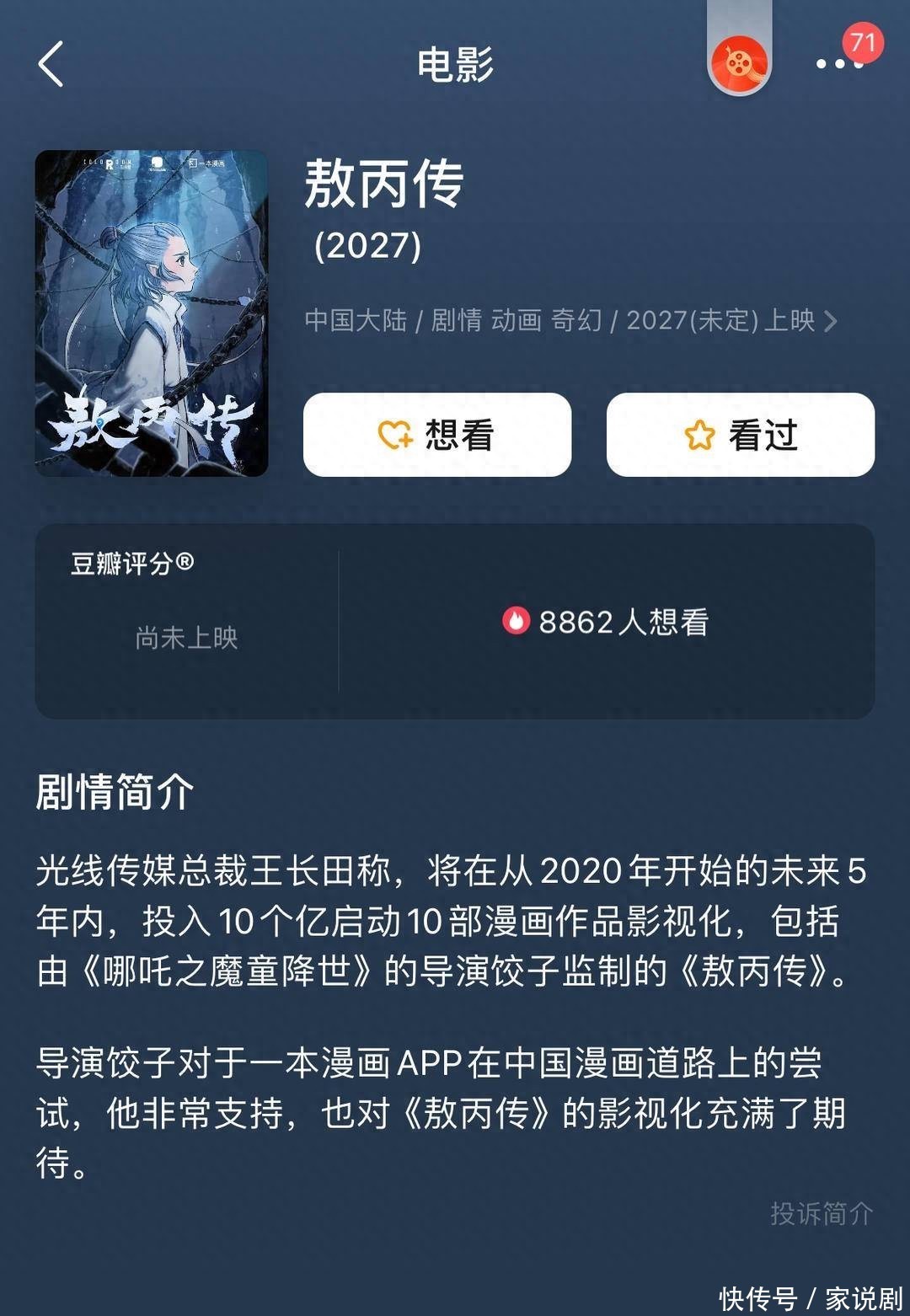 剧情简介中写说念,“光泽传媒总裁王长田称,将在从2020年运转的翌日5年内,干预10个亿启动10部漫画作品影视化,包括由《哪吒之魔童降世》的导演饺子监制的《敖丙传》。导演饺子对于一册漫画APP在中国漫画说念路上的尝试,他出奇相沿,也对《敖丙传》的影视化充满了期待。”