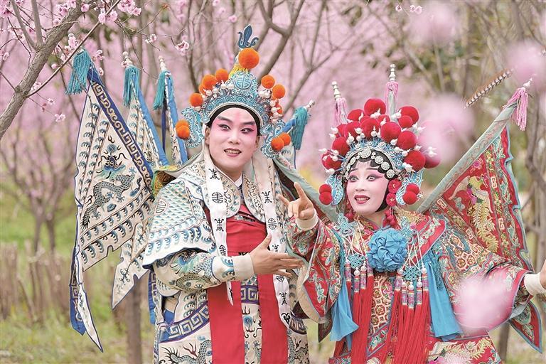 戏曲艺东说念主在秦岭国度植物园内扮演。