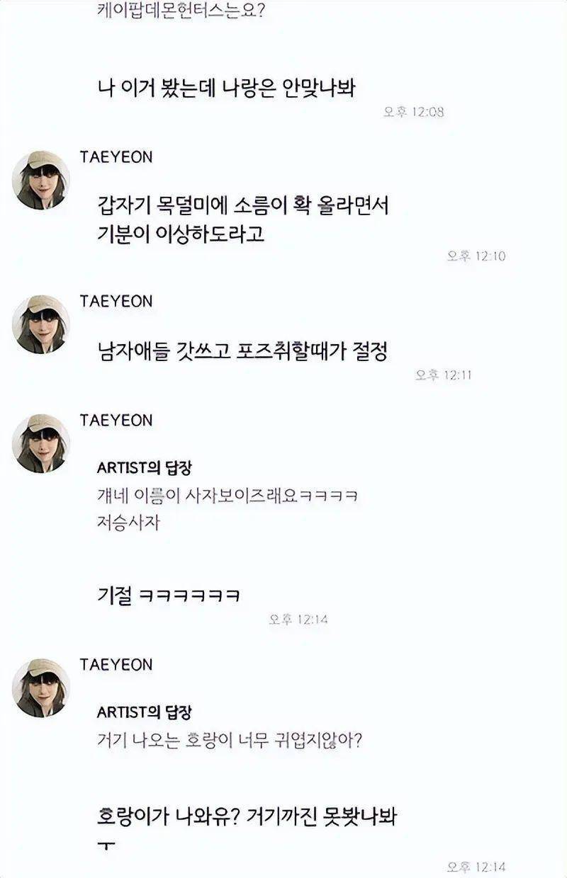 事情源于泰妍在粉丝平台回复发问时的一段对话。当被问及对《KPOP恶魔猎东谈主》的成见时,她绝不笼罩地默示:“我看了,但认为不顺应我。看得我脖子发凉…嗅觉怪怪的。”