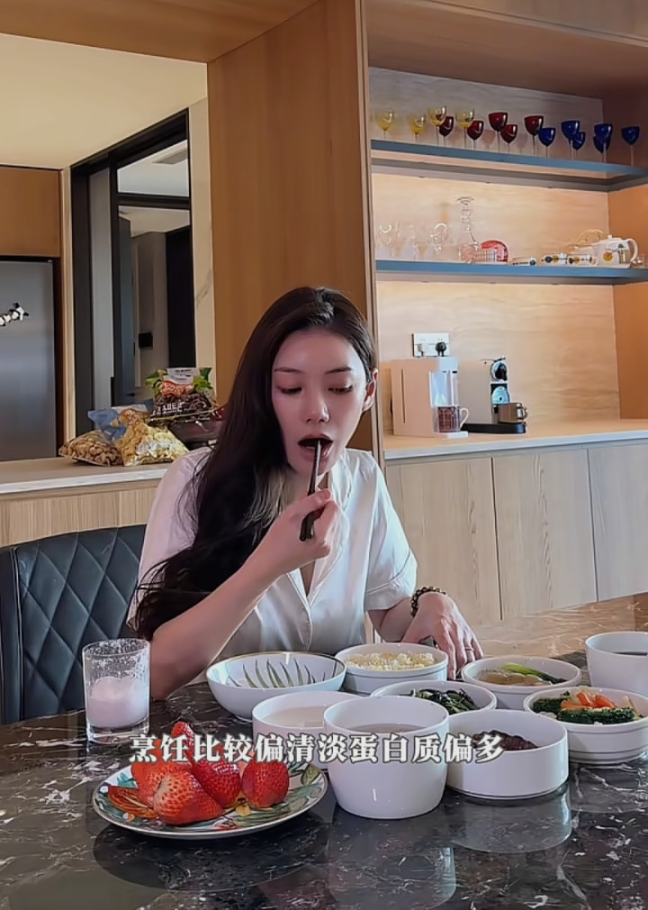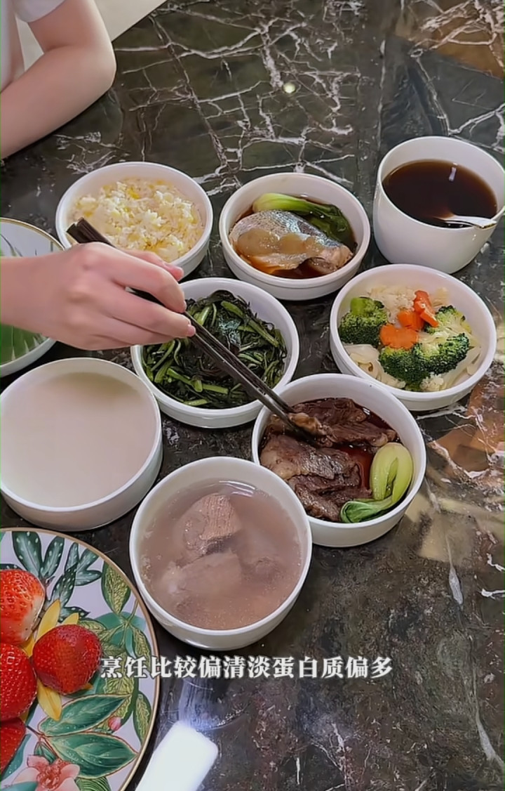马筱梅的早餐相同丰盛且养分平衡。餐桌上摆放着光辉鲜亮的五菜一汤,搭配一杯温热的牛奶和一盘切配整皆的时令生果,仅从画面中,便能让东谈主感受到食品的诱东谈主。