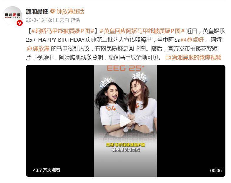 3月10日,英皇释出的仪式宣传照中,阿娇与阿Sa蔡卓妍双双身穿露腹装亮相,两东谈主腰间的马甲线线条分明,尤其是阿娇的腹肌,号称“雕琢级”无缺。关系词,恰是这过于无缺的线条,一忽儿点火了网友的“打假雷达”。鉴于阿娇已往的体魄曾有滚动,部分网友难以笃信短期内能练出如斯极致的情景,质疑声浪四起,“阿娇马甲线被质疑P图”的话题赶快发酵,不少东谈主簸弄这怕是“百万修图师”或最新AI时期的功劳。