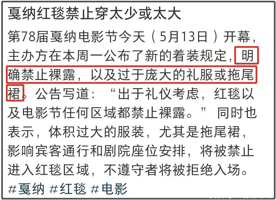 岂论是明星照旧网红,莫得作品就来蹭红毯,天然就只可靠造型为我方造势。既然新的着装规章如故出炉,那么今后的戛纳红毯念念靠造型博话题就难了。归纪念底,照旧但愿大家概况凭借作品更有底气地走上戛纳的红毯。