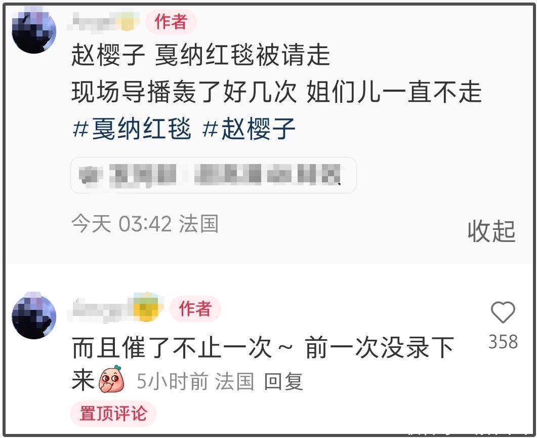 痛楚的是,赵樱子在红毯上迟误的工夫太长,被责任主说念主员亲身请走了。画面中,责任主说念主员先是走到赵樱子身边和她疏通,之后姿势尊敬但立场毅力地将赵樱子请走了。