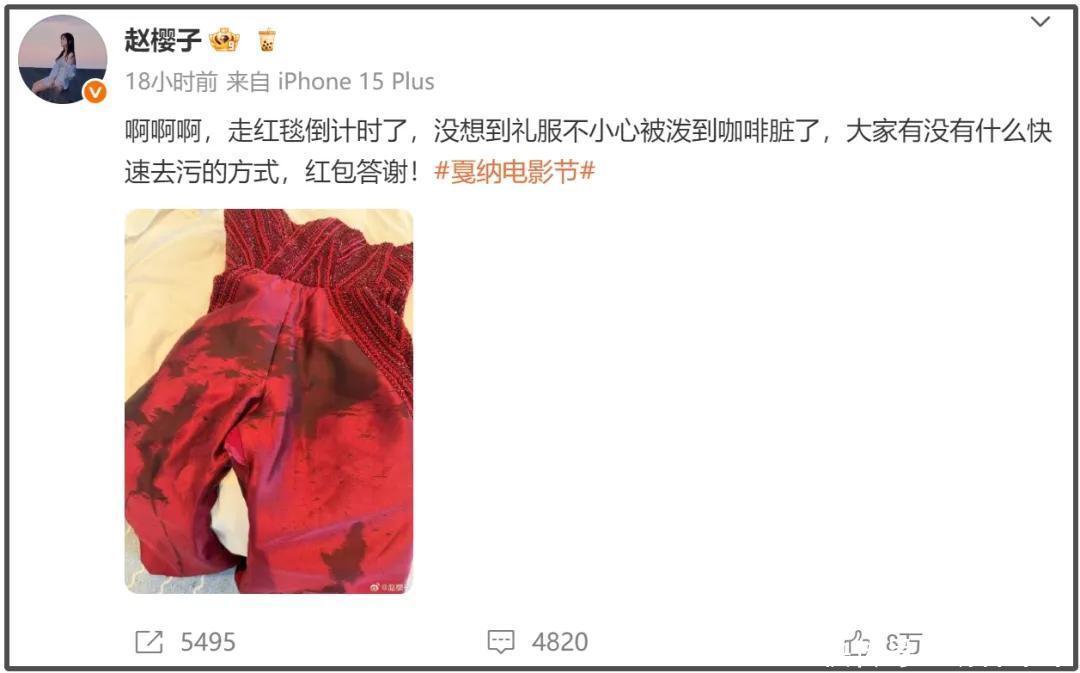 据悉,在走红毯之前,赵樱子还在酬酢平台发文求援,宣称“走红毯倒计时了,没念念到战胜不注重被泼到咖啡脏了”,还辩论网友“大家有莫得什么快速去污的步地”。关于她这番奇异的操作,网友们也莫得嘴下包涵,纷纷讥嘲她“戏过了”。