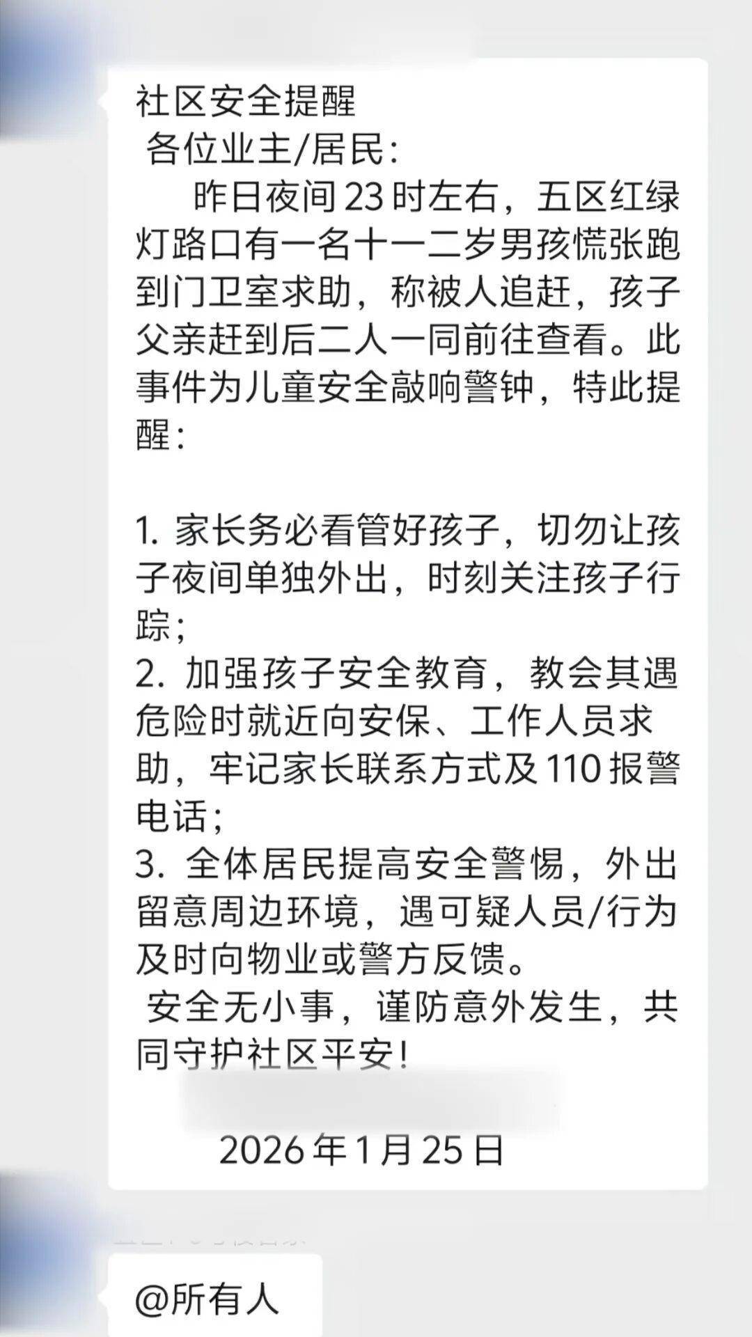 收集截图。1月27日,潇湘晨报记者相关凤凰禧苑物业,职责主说念主员称确为物业发布,其时小孩讲究晚了,走在小区外的说念路时,以为背面有东说念主追他,不笃定这东说念主是谁。他跑到门卫室乞助,孩子父亲到了后,和门卫一块去望望,没看到东说念主,“有可能是喝醉酒的东说念主”。职责主说念主员称,没看到东说念主他们也莫得报警,只可辅导住户,晚上尽量不要让孩子外出。记者相关凤凰理念念社区,别称职责主说念主员称尚未收到响应,将落实这一情况。起原 | 潇湘晨报·晨视频举报/响应