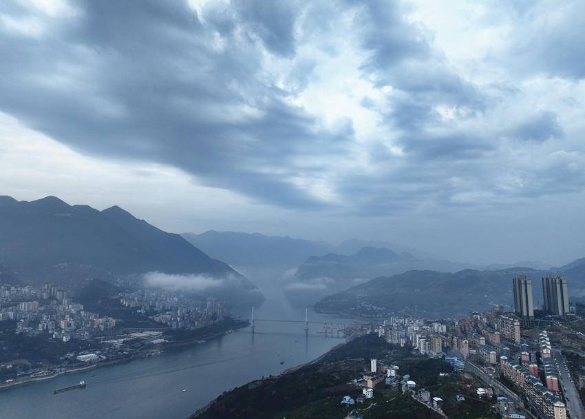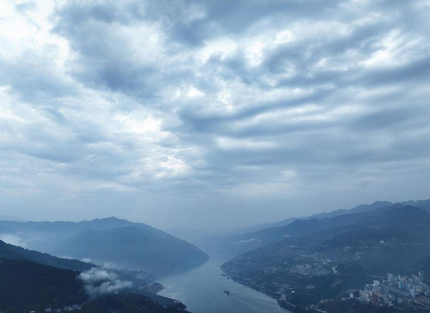 长江巴东,高峡出平湖。影影绰绰的巫峡云巅披着蝉翼般的薄纱,脉脉含情,宛如一位睡好意思东说念主,若有若无,磨蹭之中尽显诗意。云絮如灰纱轻覆天空,时而辘集、舒展、蜂拥、飞行,在寒风中翻涌出浅深不一的纹路和造型,犹如画家打翻的调色盘,将长江巫峡映衬得如梦似幻,雕梁画栋。