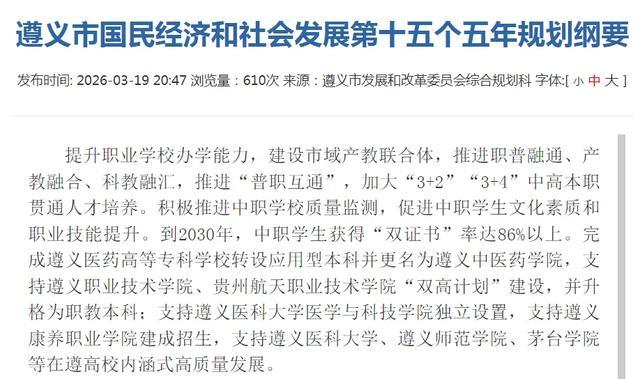 《遵义市国民经济和社会发展第十五个五年筹画摘抄》发布,其中提到“完成遵义医药高档专科学校转设利用型本科并改名为遵义中医药学院”。