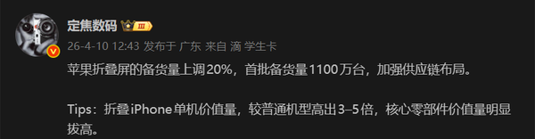 【CNMO科技音书】4月10日,数码博主@定焦数码 爆料称,苹果正在上调折叠屏iPhone的备货界限开云体育,首批备货量升迁20%至1100万台,并同步加强供应链布局。