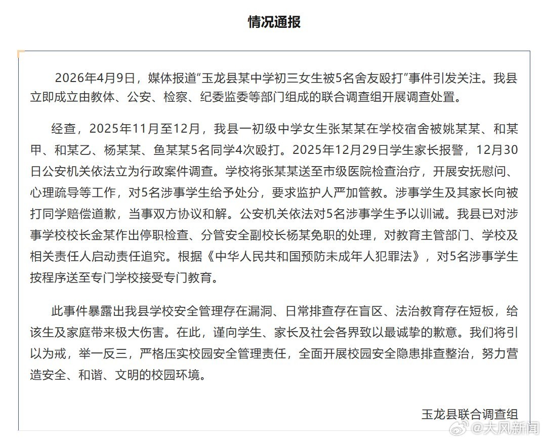 4月9日,华商报大风新闻报说念女生被舍友打校园欺凌认定3月无果。4月10日,云南丽江玉龙县发布情况通报,称已对涉事学校校长金某作出停职检查、分摊安全副校长杨某免职的管理,对教训欺诈部门、学校及关连职守东说念主驱动职守根究。对5名涉事学生按身手送至挑升学校给与挑升教训。