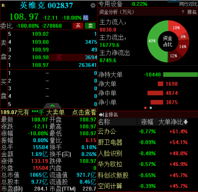 英维克开盘一字跌停,公司2026年第一季度实现买卖收入11.75亿元,同比增长26.03%;包摄于上市公司鼓舞的净利润为865.76万元,同比着落81.97%。